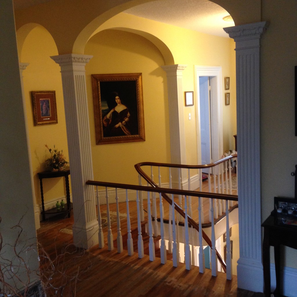 Removed wall, added arch and four columns, reshape existing two arches from 1900, duplicated banister rail in cherry and turned spindles.